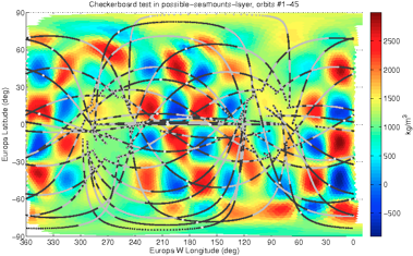 In these checkerboard tests above, the red-and-blue rectangles are two sizes of grids, and the more colorful plots show how the inversion is able to resolve those grids again from synthetic data produced from those grids. The gray-and-black curves are the lat/lon projections of the flyby trajectories (gray/black = 500m intervals in altitude, white dots are lat/lon of closest approach). Note that some regions have poor resolution and others have better resolution, according to where the flybys were closest and overlapped; i.e. the resolution of the inversion is location-dependent.